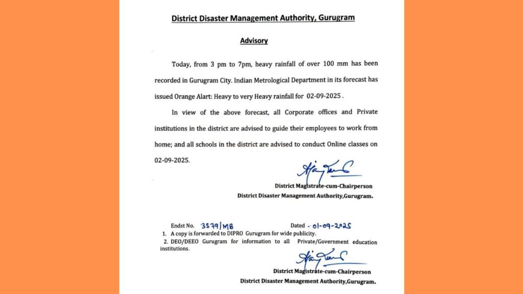 The District Disaster Management Authority, Gurugram stated in its order, “Today, from 3 pm to 7pm, heavy rainfall of over 100 mm has been recorded in Gurugram City. Indian Metrological Department in its forecast has issued Orange Alart: Heavy to very Heavy rainfall for 02-09-2025. In view of the above forecast, all Corporate offices and Private institutions in the district are advised to guide their employees to work from home; and all schools in the district are advised to conduct Online classes on 02-09-2025.”