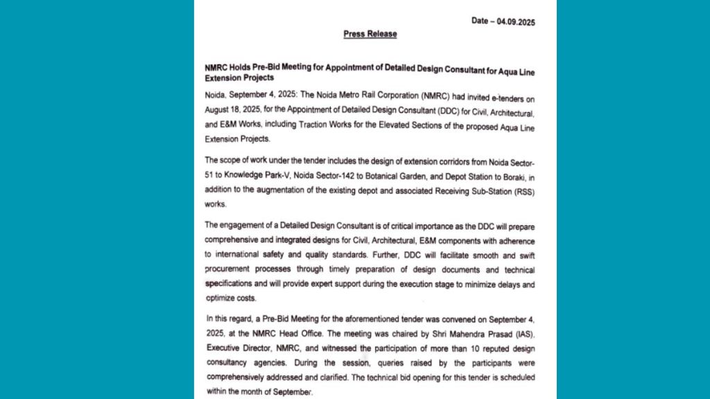 Notably, the NMRC had invited e-tenders on August 18, 2025, for the Appointment of Detailed Design Consultant (DDC) for Civil, Architectural. and E&M Works, including Traction Works for the Elevated Sections of the proposed Aqua Line Extension Projects.
