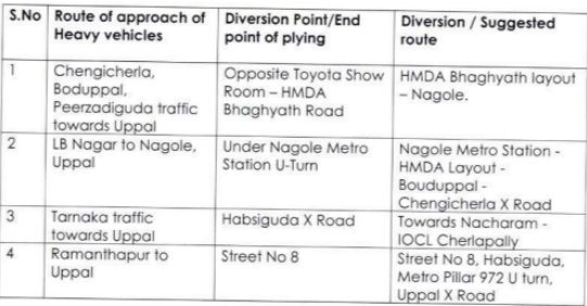 – Tarnaka to Uppal: The diversion point is Habsiguda X Road. The vehicles will be rerouted via Nacharam, IOCL Cherlapally.