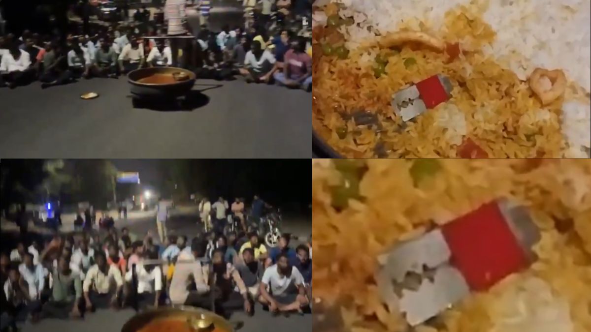 Students at Osmania University’s Godavari hostel started a protest after one of them found a razor blade in the food served at the hostel. The upset students sat on the university’s main road, holding the curry vessel and the plate.