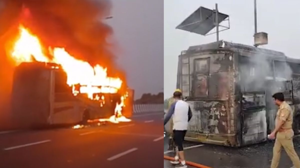 Lucknow: A massive fire broke out in a moving bus in Lucknow, resulting in five people being burnt alive on Thursday. The sleeper bus was travelling from Delhi to Bihar when it suddenly caught fire on Kisan Path near Mohanlalganj. Several videos from the spot show the entire bus engulfed in fire within few minutes. It is told that the bus driver broke the glass and jumped out. Most of the passengers were sleeping at the time of the accident. The passengers woke up after the bus filled with smoke. There was an extra seat near the driver, due to which the passengers had difficulty in getting down. Many passengers got stuck in it and fell.