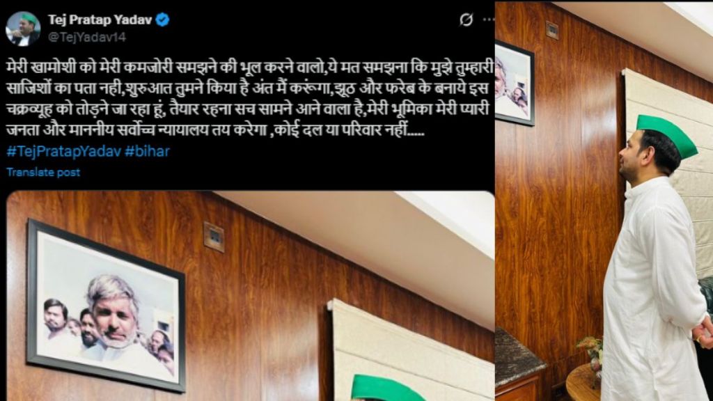In another twist, Tej Pratap Yadav, son of former Chief Minister Lalu Prasad Yadav, has shared a post hinting at a possible move to the Supreme Court. He took to X and indirectly warned that he might approach the Supreme Court to “end what they started.” Just days ago, RJD supremo Lalu Prasad Yadav expelled his elder son Tej Pratap from the party for six years. In a dramatic turn, he was also reportedly ousted from the family. Lalu Prasad cited Tej Pratap’s public misconduct as the reason for his expulsion. Tej Pratap has shared a picture with the post he has made. In it, Tej Pratap is seen in a white kurta and green cap. He is standing and looking at his father’s picture.