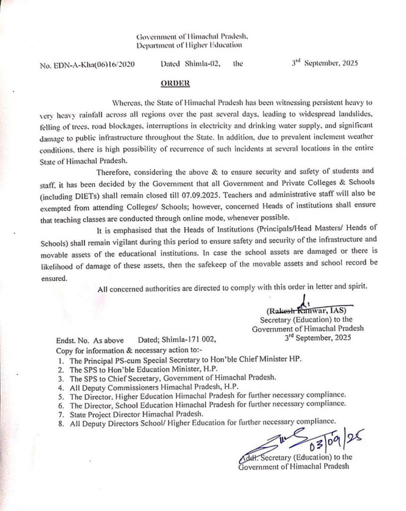 In an official notice issued on Wednesday, Education Secretary Rakesh Kanwar directed that all schools, colleges will remain shut across the state until further order. Following multiple landslides in Himachal Pradesh, triggered by torrential showers, schools remained closed in several districts on September 2, 2025.