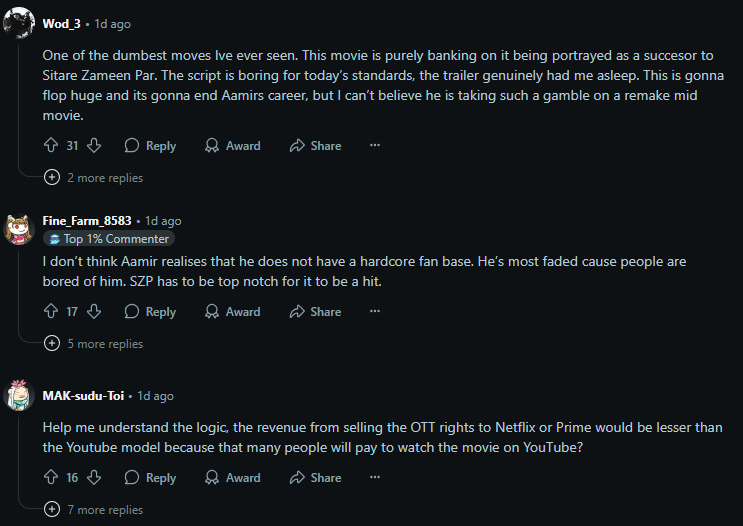 Another commented, “Help me understand the logic, the revenue from selling the OTT rights to Netflix or Prime would be lesser than the Youtube model because that many people will pay to watch the movie on YouTube?”