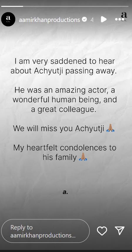 Expressing his grief, Aamir Khan said in a statement, “I am very saddened to hear about Achyutji’s passing away. He was an amazing actor, a wonderful human being, and a great colleague. We will miss you, Achyutji. My heartfelt condolences to his family.”