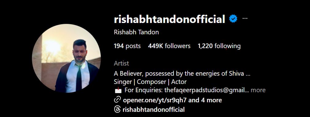 According to his Instagram bio, Rishab Tandon was a singer, composer and actor. He also mentioned in his bio, “a Believer, possessed by the energies of Shiva …”