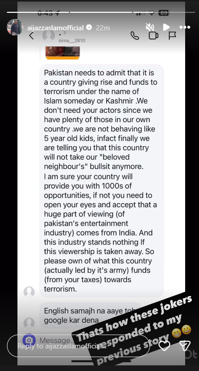 The Instagram story led to a flood of backlash from Indian users and in response, Aijaz posted a video on Instagram compiling the screenshots of messages, captioning it “And this is how they responded to my old story.”