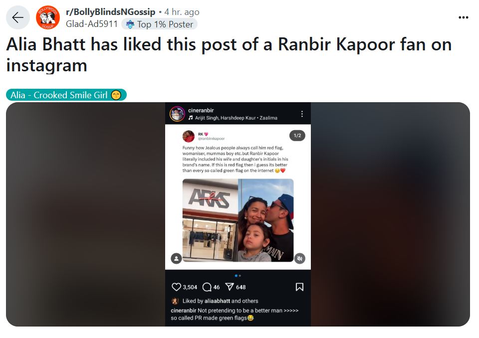 Alia Bhatt and Ranbir Kapoor are adored by their fans as they see them as power couple. However, they have been subjected to trolling on social media but the couple always maintained their peace. According to a post on Reddit, Alia recently liked a post on Instagram which defended Ranbir Kapoor against the tags of ‘red flag and womaniser’.