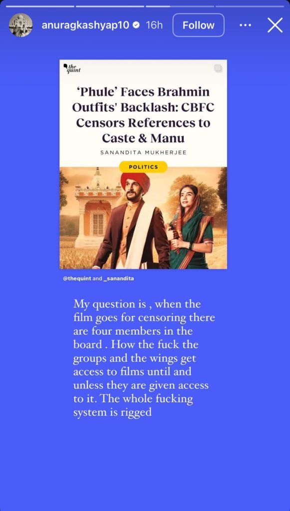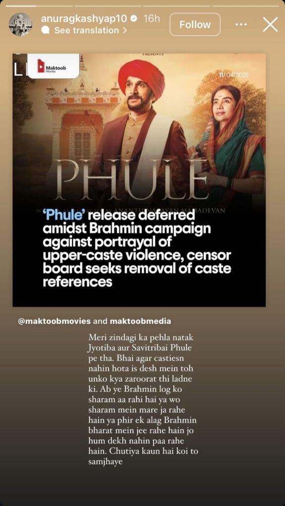 This led filmmaker Anurag Kashyap to write a sharp critique of the CBFC and the system on Instagram stories. Anurag wrote, “Meri zindagi ka pehla natak Jyotiba aur Savitribai Phule pe tha. Bhai agar casteism nahin hota is desh mein toh unko kya zaroorat thi ladne ki. Ab ye Brahmin log ko sharam aa rahi hai ya wo sharam mein mare ja rahe hain ya phir ek alag Brahmin Bharat mein jee rahe hain jo hum dekh nahin paa rahe hain, ch****a kaun hai koi to samjhave. (The first play I ever did in my life was on Jyotiba and Savitribai Phule. If casteism didn’t exist in this country, why would they have needed to fight against it? Now these Brahmin groups either feel ashamed, are dying of shame, or perhaps they’re living in some alternate Brahmin-only India that we’re unable to see. Someone please explain who’s the real fool here?)”