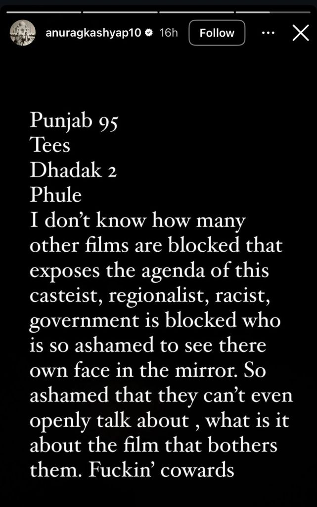 He also slammed what he sees as a pattern that films like Punjab 95, Tees, Dhadak 2 are being targeted for reflecting uncomfortable truths. In the third Instagram story he wrote “I don’t know how many other films are blocked that exposes the agenda of this casteist, regionalist, racist government… so ashamed to see their own face in the mirror. So ashamed that they can’t even openly talk about what it is about the film that bothers them. F*****g cowards.”