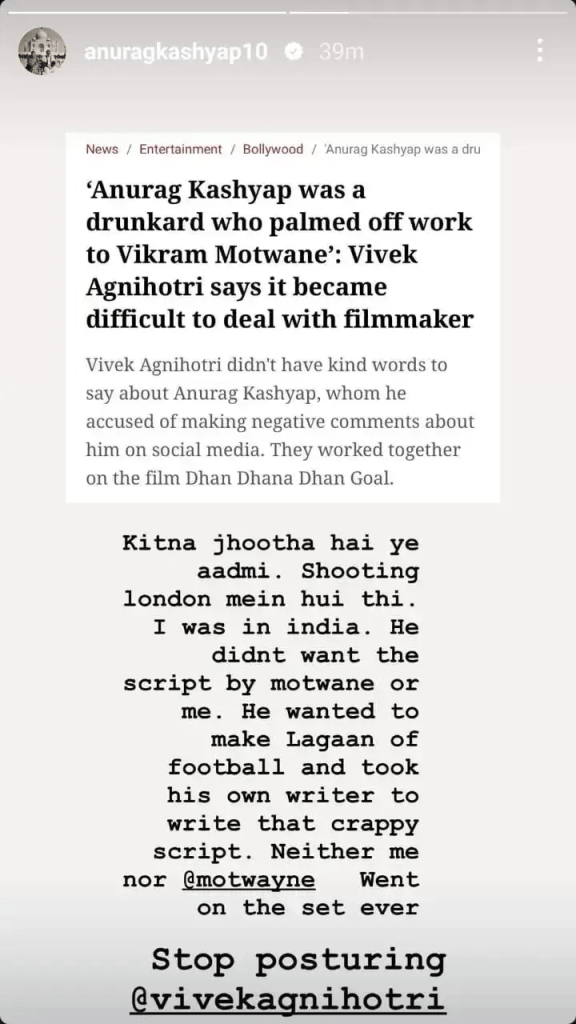 Anurag Kashyap took to Instagram to clear his side of the story and sharing a screenshot of the report where Vivek’s claims were written, he wrote: “Kitna jhootha hai ye aadmi. Shooting London mein hui thi. I was in India. He didn’t want the script by Motwane or me. He wanted to make Lagaan of football and took his own writer to write that crappy script. Neither me nor @motwayne went on the set ever. Stop posturing @vivekagnihotri.”