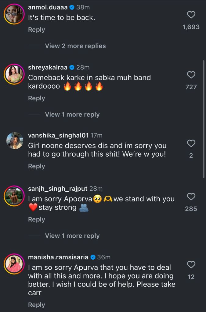 She made two posts, where in the first one she shared dozens of screenshots of the threatening messages she received in her DMs. The comments included rape threats and acid attack threats for the remark she made on India’s Got Latent episode. In the caption, Apoorva also wrote that the messages were not even 1% of what she had received.