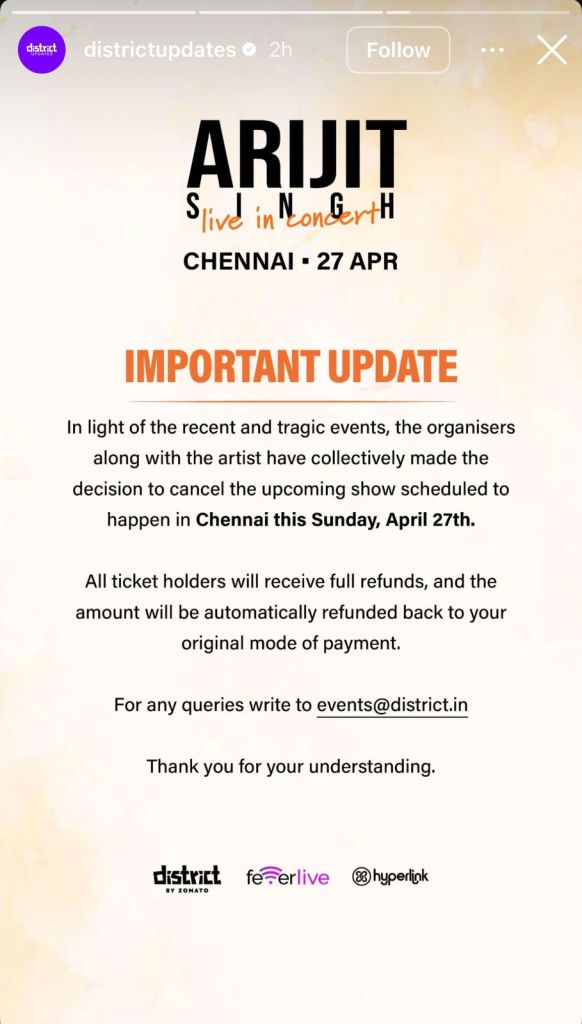 A note from the organisers Districtupdates read, “In light of the recent and tragic events, the organisers along with the artist have collectively made the decision to cancel the upcoming show scheduled to happen in Chennai this Sunday, April 27th. All ticket holders will receive full refunds, and the amount will be automatically refunded back to your original mode of payment.”