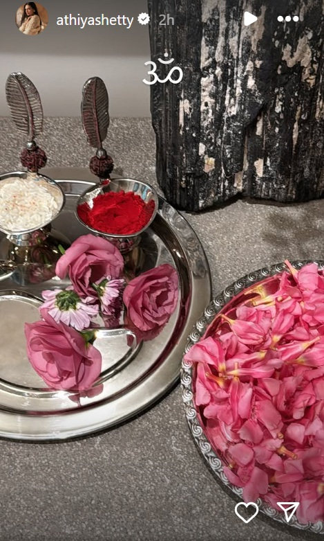 Taking to Instagram, Athiya shared a glimpse of the welcome ceremony. The picture featured two plates filled with flowers and kumkum (teeka). Athiya simply captioned the post with ‘Om,’ reflecting a sense of spiritual significance.