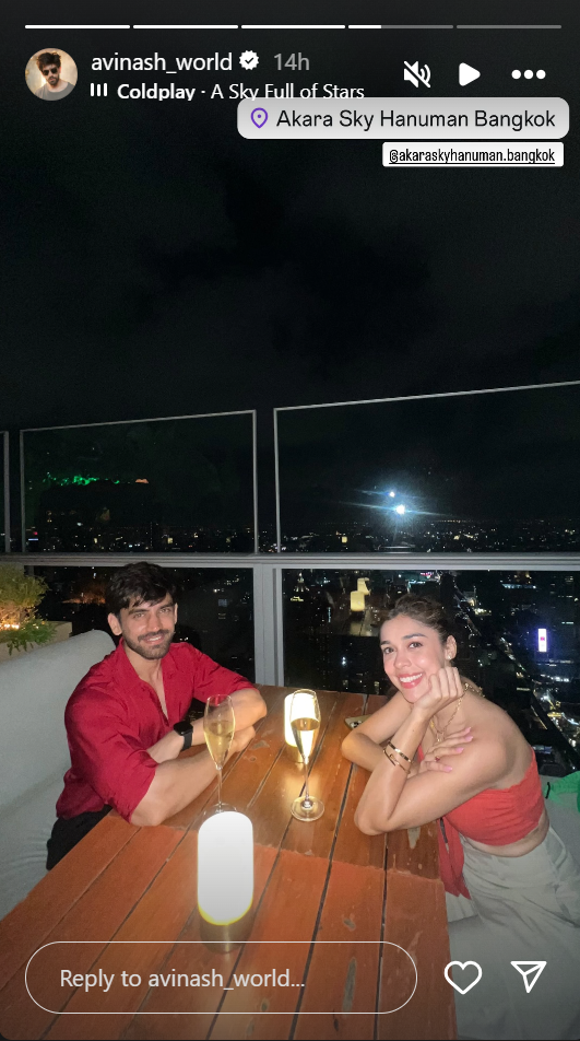 Avinash and Eisha are currently in Bangkok, Thailand, to shoot for their upcoming music video. But in between their hectic schedules, the couple seems to manage some time off with each other. A photo of their cozy dinner date at an upscale rooftop restaurant in which both are seen twinning in red at Bangkok has now gone viral, leaving the fans going crazy. The pic was posted by Avinash on his Instagram story. Many believe this outing is a concreate proof that the two are more than just co-stars.