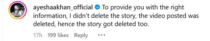 The screenshot of Ayesha was posted by Bollywood Bubble on Instagram. The actor also clarified that she did not delete her story. She commented, “To provide you with the right information, I didn’t delete the story, the video posted was deleted, hence the story got deleted too.”