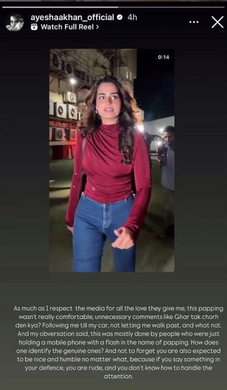 Actor Ayesha Khan, who has been gaining popularity on social media, has called out paparazzi after she had an uncomfortable experience with them. She shared her video on Instagram and expressed her anger on the people passing ‘unnecessary’ comments. The original video was later deleted after Ayesha shared opinion.
