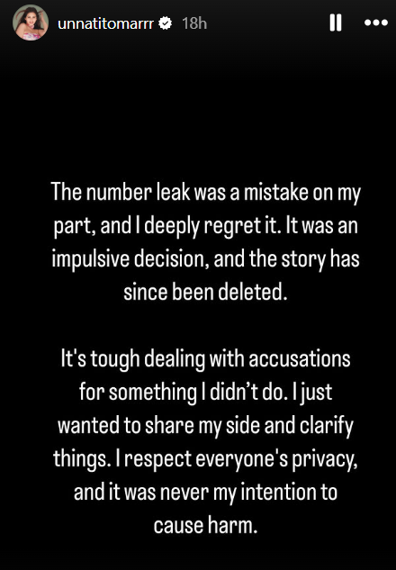 In defence, Unnati wrote, “The number leak was a mistake on my part, and I deeply regret it. It was an impulsive decision, and the story has since been deleted. It’s tough dealing with accusations for something I didn’t do. I just wanted to share my side and clarify things. I respect everyone’s privacy, and it was never my intention to cause harm.”
