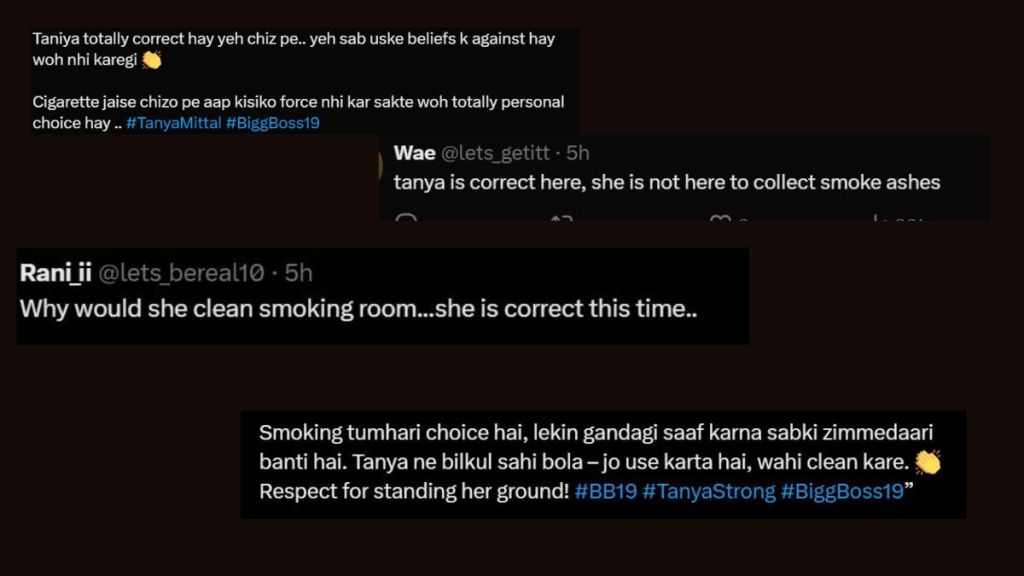One viewer wrote, “This time Tanya is correct…if u smoke, it is your duty to clean it .. because not everyone smokes..nobody likes the smell.” Another person commented, “Smoking area kab se cleaning duty aa gaya bhai…first time in history of bigboss smoking area cleaning mein jhagda ho raha hai …”