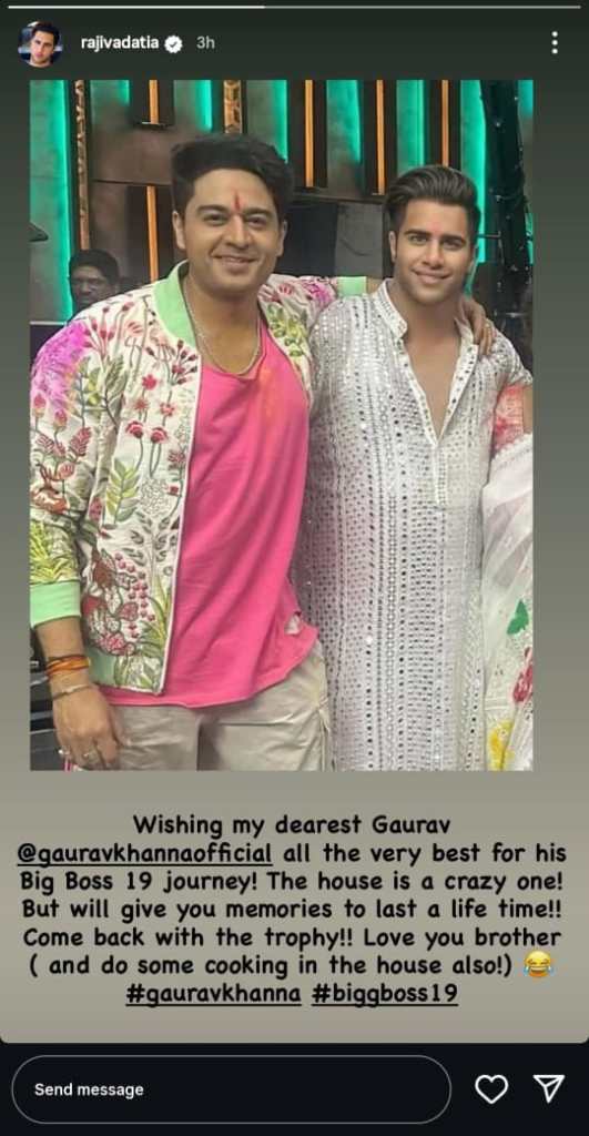 Rajiv Adatia wrote on his Instagram story, “Wishing my dearest Gaurav all the very best for his Big Boss 19 journey! The house is a crazy one! But it will give you memories to last a life time!! Come back with the trophy!! Love you, brother (and do some cooking in the house also!)”