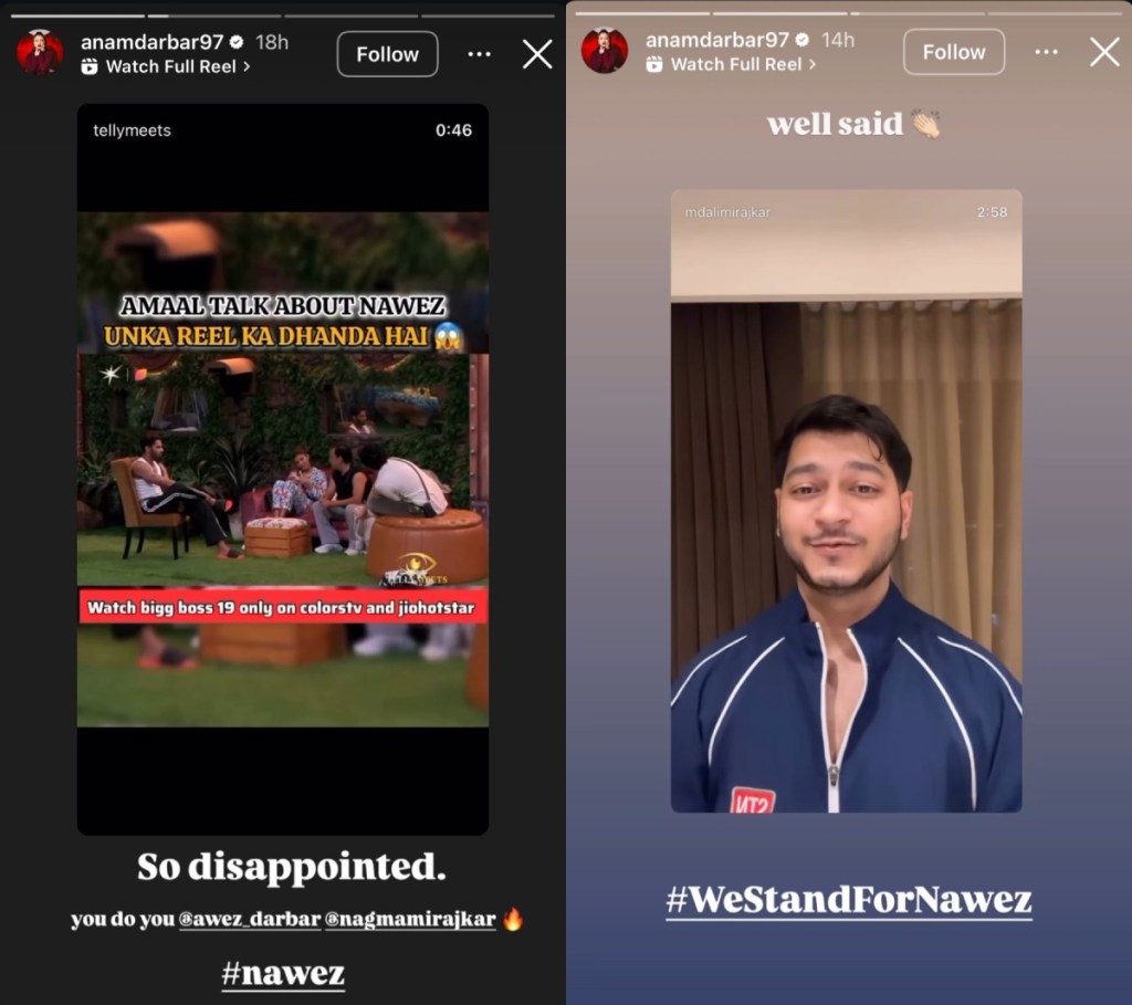 His younger sister, Anam Darbar, shared her reaction on Instagram Stories: “So disappointed. You do you.” She also reshared Ali Mirajkar’s post on her story and wrote, “We Stand For Nawez.”