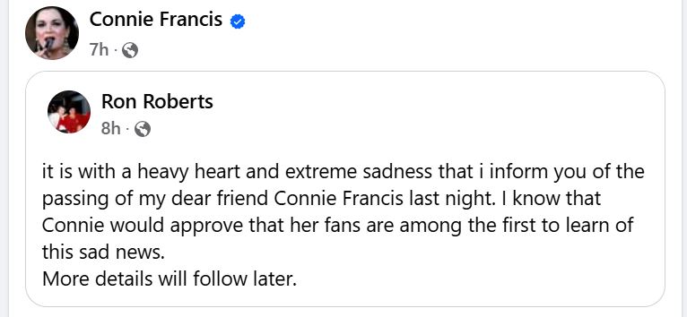 While announcing the heartbreaking news of Connie Francis’ death, Ron wrote on Facebook, “It is with a heavy heart and extreme sadness that I inform you of the passing of my dear friend Connie Francis last night.’