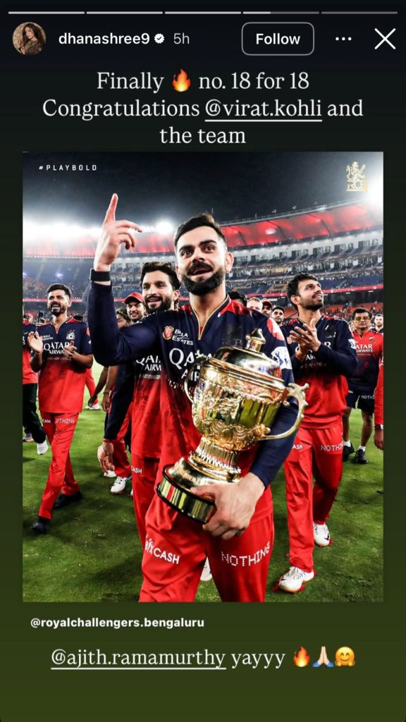 One of the most talked about reactions, however, came from Dhanashree Verma, the ex-wife of Yuzvendra Chahal, whose team PBKS was defeated by RCB in the final. Taking to her Instagram Stories, Dhanashree shared a photo of Kohli holding the trophy and wrote, “Finally no. 18 for 18. Congratulations @virat.kohli and the team.” She also praised Ajith Ramamurthy, the Head of Content and Digital at RCB.