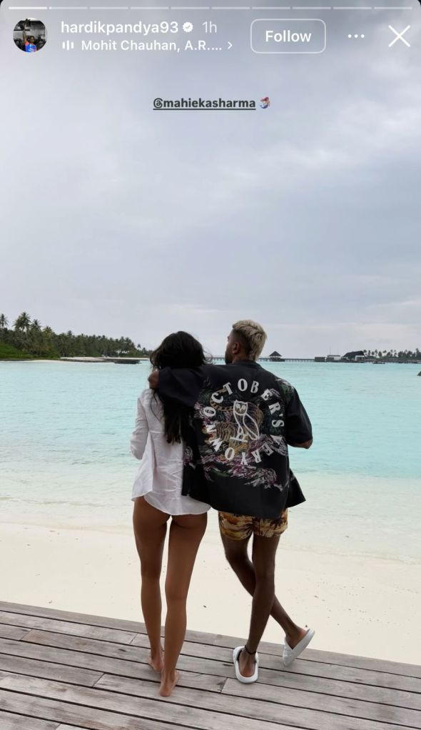 In one of the Instagram story, Hardik is seen casually in an oversized shirt, shorts, and slippers, while keeping his hand on Mahieka, dressed in a white-shirt dress. He tagged her Instagram handle.