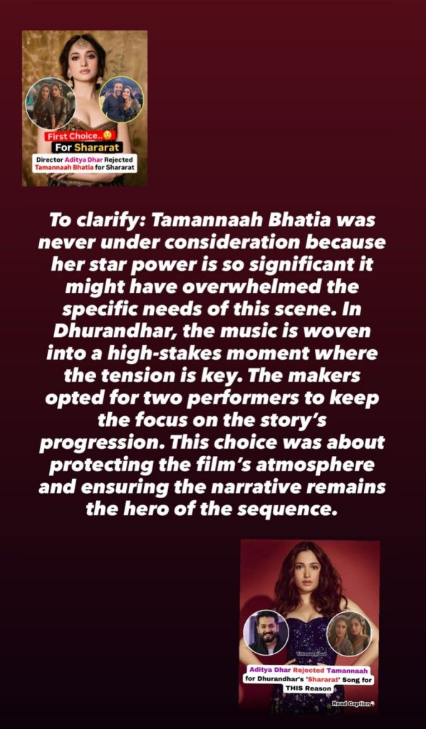 He wrote on Instagram, “To clarify: Tamannaah Bhatia was never under consideration because her star power is so significant that it might have overwhelmed the specific needs of this scene. In Dhurandhar, the music is woven into a high-stakes moment where the tension is key. The makers opted for two performers to keep the focus on the story’s progression. This choice was about protecting the film’s atmosphere and ensuring the narrative remains the hero of the sequence.”