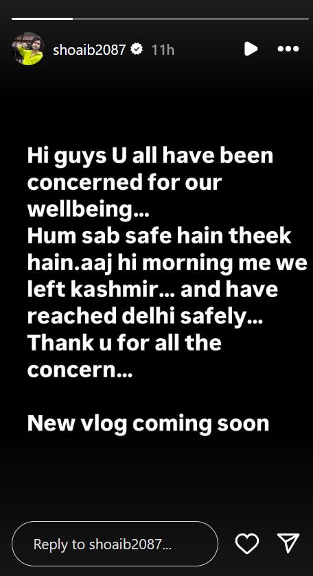 Giving update about him and his family’s safety amid the attack, Shoaib wrote on Instagram, “Hi guys U all have been concerned for our wellbeing… Hum sab safe hain theek hain. aaj hi moring me we ledt kashmir.. and have reached delhi safely… Thank u for all the concern… New vlog coming soon’.” (sic).