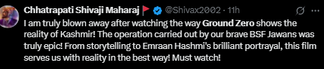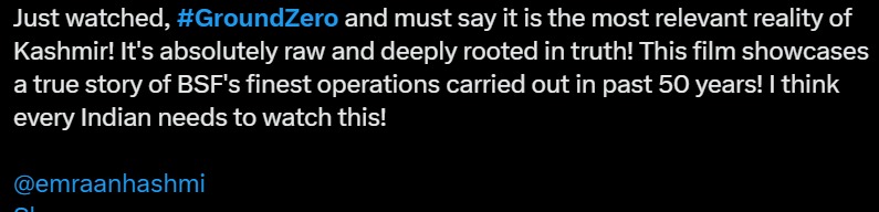 Another user mentioned the same feeling after watching a movie, wrote, “I am truly blown away after watching the way Ground Zero shows the reality of Kashmir! The operation carried out by our brave BSF Jawans was truly epic! From storytelling to Emraan Hashmi’s brilliant portrayal, this film serves us with reality in the best way! Must watch!”