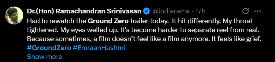 While some other user expressed their emotions and wrote, “Had to rewatch the Ground Zero trailer today. It hit differently. My throat tightened. My eyes welled up. It’s become harder to separate reel from real. Because sometimes, a film doesn’t feel like a film anymore. It feels like grief. #GroundZero #Emraan Hashmi.”