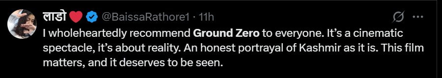 Netizens also support this notion of film-making portrayal of Kashmir, even more impactful by sharing, “I wholeheartedly recommend Ground Zero to everyone. It’s a cinematic spectacle, it’s about reality. An honest portrayal of Kashmir as it is. This film matters, and it deserves to be seen.”
