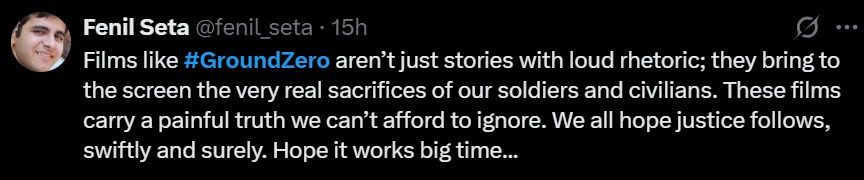On the other hand, a social media user emphasized that films like #GroundZero highlight the harsh realities and sacrifices of soldiers and civilians, urging audiences not to overlook these painful truths., “Films like #GroundZero aren’t just stories with loud rhetoric; they bring to the screen the very real sacrifices of our soldiers and civilians. These films carry a painful truth we can’t afford to ignore. We all hope justice follows, swiftly and surely. Hope it works big time…”
