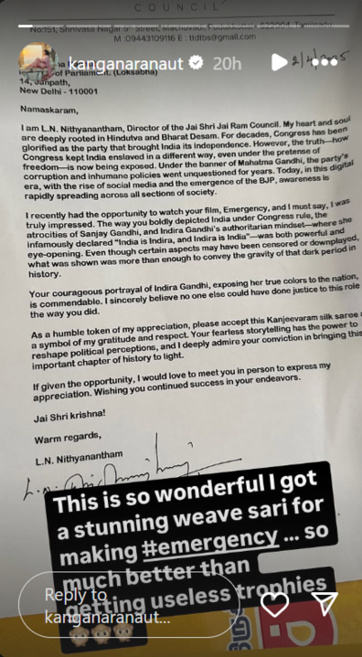 Calling it a far better gesture than any award, Kangana shared the picture of the letter on her Instagram stories and wrote “This is so wonderful I got a stunning weave sari for making #emergency…so much better than getting useless trophies.”