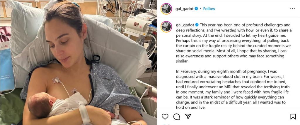 Gal Gadot wrote on Instagram, “This year has been one of profound challenges and deep reflections, and I’ve wrestled with how, or even if, to share a personal story. At the end, I decided to let my heart guide me. Perhaps this is my way of processing everything, of pulling back the curtain on the fragile reality behind the curated moments we share on social media. Most of all, I hope that by sharing, I can raise awareness and support others who may face something similar.”