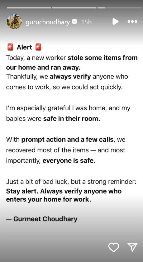 He wrote on Instagram, “Alert: Today, a new worker stole some items from our home and ran away. Thankfully, we always verify anyone who comes to work so that we could act quickly. I’m especially grateful I was home, and my babies were safe in their room. With prompt action and a few calls, we recovered most of the items – and most importantly, everyone is safe. Just a bit of bad luck, but a strong reminder: Stay alert. Always verify anyone who enters your home for work. Gurmeet Choudhary.”