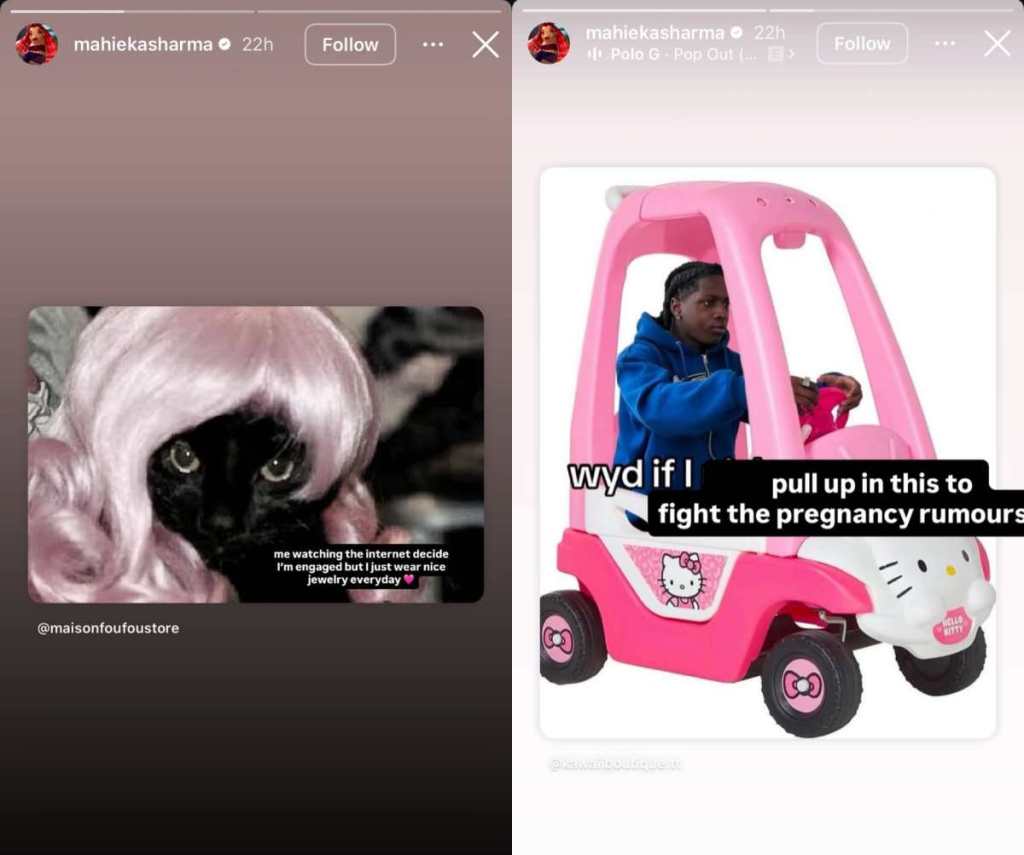But Mahieka has now put an end to the engagement buzz with a cheeky Instagram post. On Friday, she shared a picture of a black kitten with pink hair and wrote, “Me watching the internet decide I’m engaged when I just wear nice jewellery every day (sic).” She also shared another post, joking that pregnancy rumours might be next. Mahieka uploaded a picture of a man driving a toy car and wrote, “Wyd if I pull up in this to fight the pregnancy rumours.”