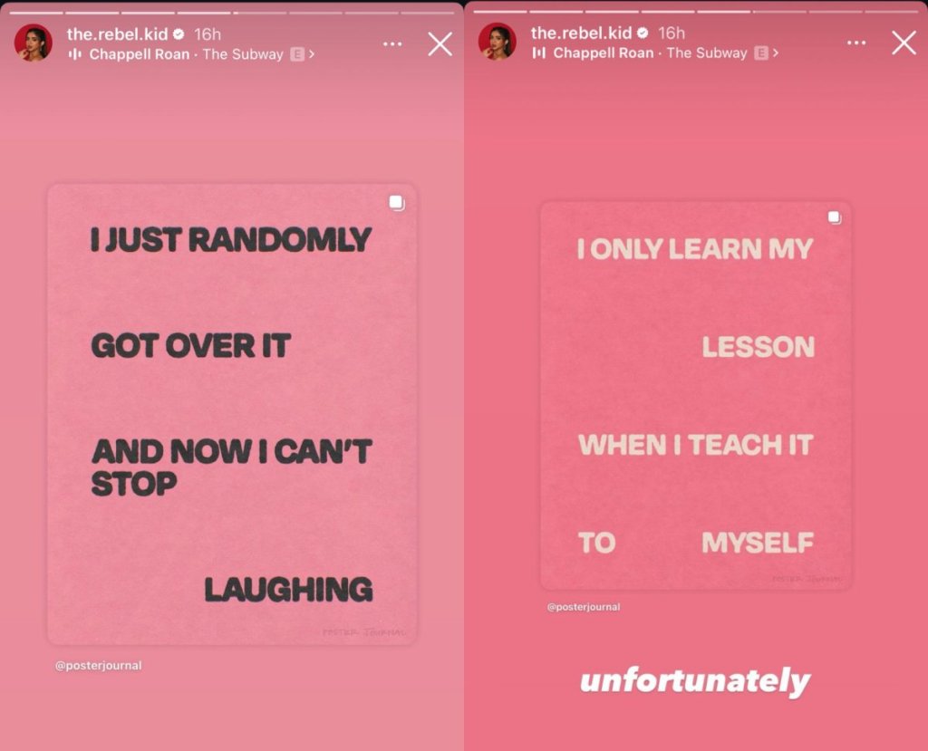 She then followed up on Stories sharing a string of cryptic quotes, “I just randomly got over it and now i can’t stop laughing.” Another read, “I only learn my lesson when i teach it to myself” which she captioned with a resigned “unfortunately.”