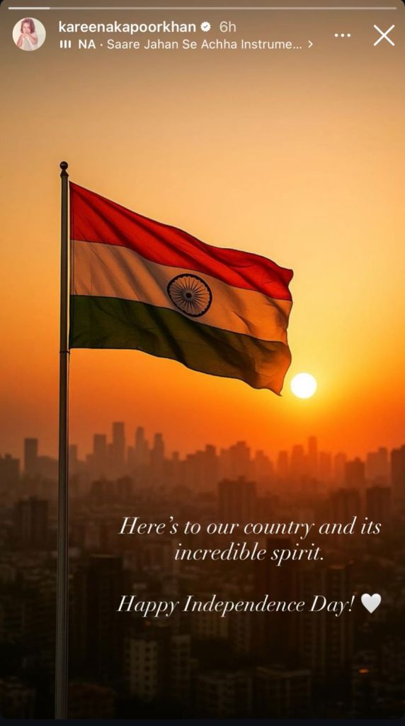 Kareena Kapoor Khan shared her tribute with the message, “Here’s to our country and its incredible spirit. Happy Independence Day.”