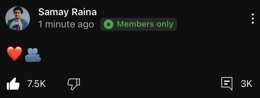 In the midst of this controversy, Samay Raina took to his YouTube community channel to share a heartfelt post for his members, featuring a red heart emoji and hugs. Despite the post being exclusive to premium members, it quickly garnered over 7.5k likes within just one minute. Fans of Samay flooded the comment section with love and support, with many speculating that had the post been made publicly, it would have easily crossed 100k likes in no time.