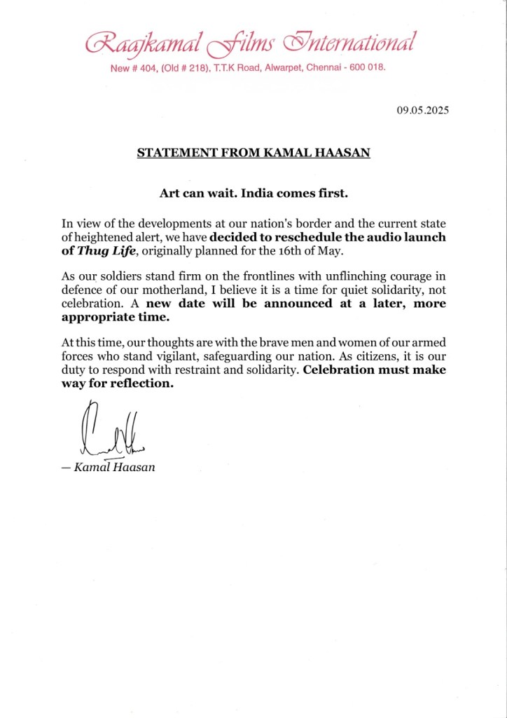 The title of the statement read, “Art can wait. India comes first”. It adds, “In view of the developments at our nation’s border and the current state of heightened alert, we have decided to reschedule the audio launch of Thug Life, originally planned for 16th of May (sic).”