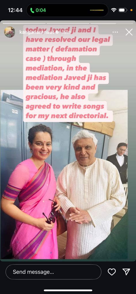 Kangana took to Instagram to share the news with her fans, posting a happy picture along with the update. She wrote, “Today, Javed ji and I have resolved our legal matter (defamation case) through mediation. In the mediation, Javed ji has been very kind and gracious. He has also agreed to write songs for my next directorial.”