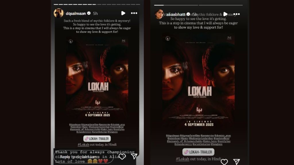 Giving a shoutout to the team of ‘Lokah: Chapter 1’, Alia Bhatt wrote on Instagram, “Such a fresh blend of mythic folklore and mystery! So happy to see the love it’s getting. This is a step in cinema that I will always be eager to show my love and support for!”.