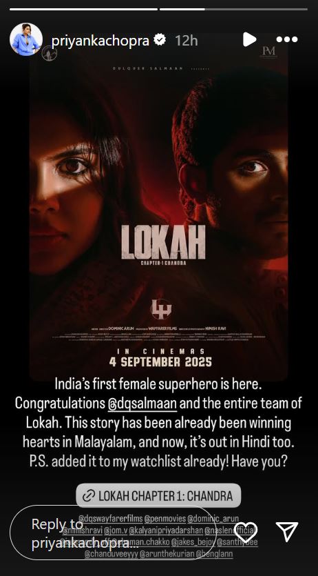 Praising the film, Priyanka wrote on Instagram, “India’s first female superhero is here. Congratulations Dulquer Salmaan and the entire team of Lokah. This story has already been winning hearts in Malayalam, and now, it’s out in Hindi too. PS: added it to my watchlist already! Have you?”
