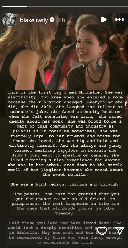 Blake Lively posted a picture with Michelle and penned a long note for her. She wrote, “This is the first day I met Michelle. She was electricity. You knew when she entered a room because the vibration changed. Everything she did, she did 200%. She laughed the fullest at someone’s joke, she faced authority head on when she felt something was wrong, she cared deeply about her work, she was proud to be a part of this community and industry as painful as it could be sometimes, she was fiercely loyal to her friends and brave for those she loved, she was big and bold and distinctly herself.”