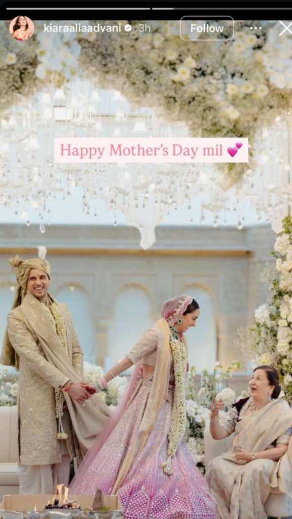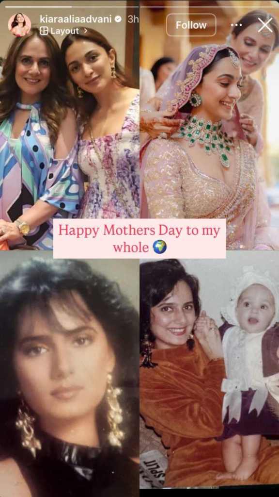 Kiara shared a heartfelt collage image on her Instagram stories, which included a candid moment from her wedding where her mother lovingly adjusted her dupatta, a throwback photo of her mother, and a nostalgic baby Kiara with her mother holding her. She captioned the image “Happy Mother’s Day to my whole world.”