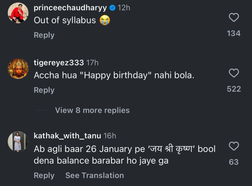 Social media users flooded platforms with humorous reactions. Comments ranged from “Out of syllabus!” and “Acha hua happy birthday nahi bola” to “Ab agli baar 26 January pe Jai Shri Krishna bol dena, balance barabar ho jaayega.”