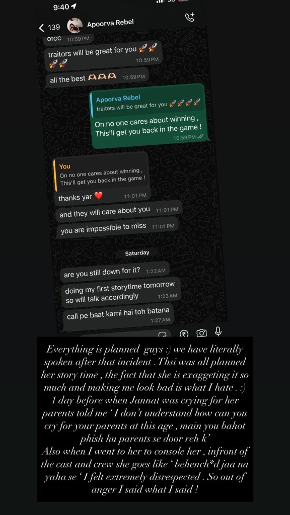 In the series of Instagram stories, she further posted a video where she said she was “shivering” after watching Apoorva’s YouTube video. “I literally don’t want to do any of this but it’s just I am, I am feeling pathetic right now after seeing Apoorva’s YouTube video. She is painting me into this villain which I am not, I am literally shivering right now. I mean, I will tell you something—what happened one day before, Jannat was crying and for her parents. Tabhi Apoorva mujhse bolti hai ki arre kya parents ke liye ro rahi hai? Kya ye paagalpanti hai.”
