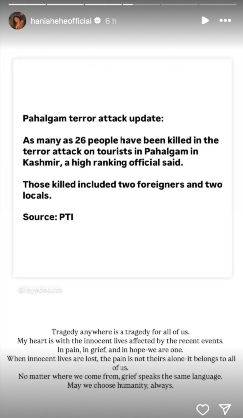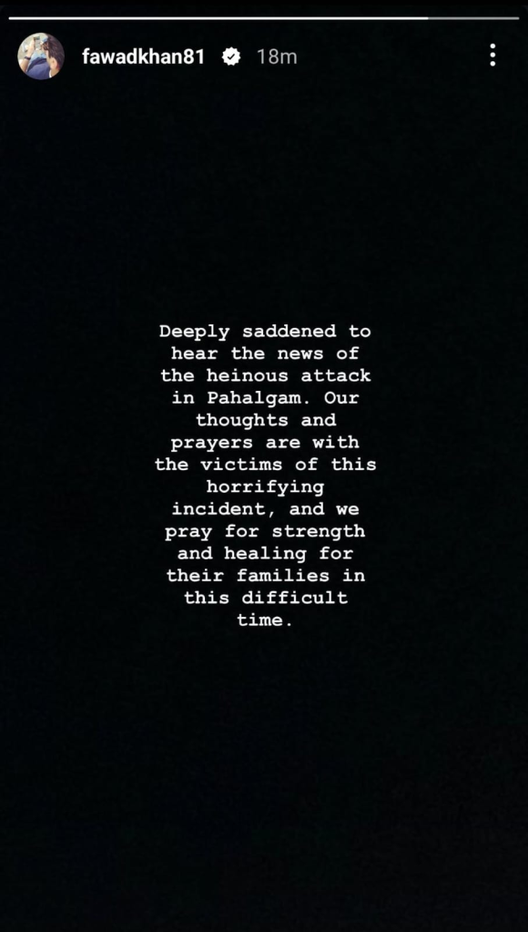 Pakistani actors Fawad Khan, Hania Aamir, and Mawra Hocane took to social media to express their anguish over the senseless violence. They extended heartfelt condolences to the bereaved families and called for unity in the face of terror. Hania Aamir shared a post where she wrote, “Tragedy anywhere is a tragedy for all of us. My heart is with the innocent lives affected by the recent events. In pain, in grief, and in hope we are one. When innocent lives are lost, the pain is not theirs alone.. it belongs to all of us. No matter where we come from, grief speaks the same language. May we choose humanity, always.” On the other pakistani celebs who have always worked in Bollywood shared their take on this unfortunate incident. Fawad Khan and Sanam Teri Kasam actor Mawra Hocane also shared their messages. Fawad wrote on Instagram Stories, “Deeply saddened to hear the news of the heinous attack in Pahalgam. Our thoughts and prayers are with the victims of this horrifying incident and we pray for strength and healing for their families in this difficult time”. Mawra shared, “My deepest condolences to the affected families… An act of terrorism against one is terrorism against all…What’s happening to the world.”